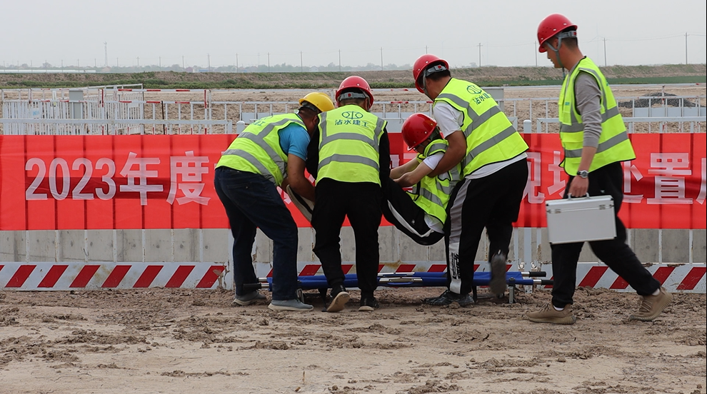 綜合應急演練在胡營河攔蓄項目南趙節制閘現場進行,下午四時,演練正式拉開帷幕。現場人員按照演練要求迅速啟動應急預案,首先進行的是防洪度汛應急演練,各負責人及時到崗到位,迅速層層匯報事故詳情,救援突擊隊迅速作出反應,組織人員進行搶險救援。接下來又進行了火災、物體打擊、機械傷害的應急演練,救援小組通知工作人員緊急疏散,醫療救援迅速小組展開救援,利用滅火器、消防栓迅速展開滅火,并對受傷人員進行現場的醫療搶救后迅速送至醫院進行救治。整個演練過程進展有序,演練人員有條不紊,各司其職,完成了發現險情,迅速作出處置措施,正確處理現場情況等步驟,演練取得了預期效果。