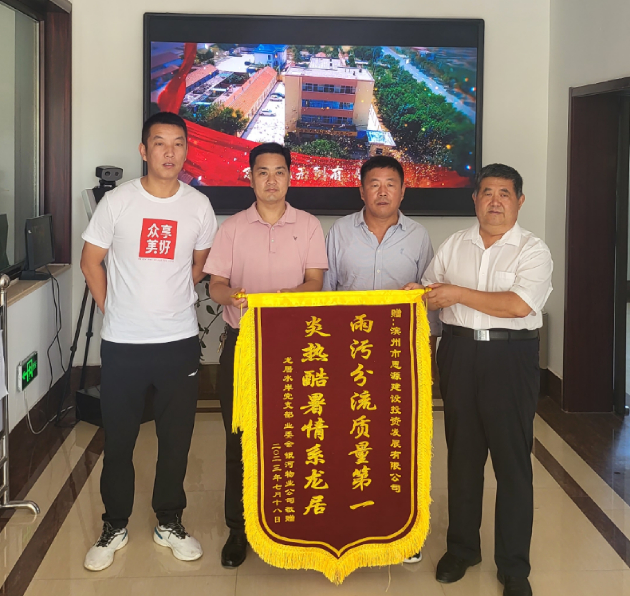 金秋暖陽,周盈始盛。9月7日,沾化區(qū)龍居水岸小區(qū)黨支部書記高守國、濱州市沾化區(qū)銀河物業(yè)管理服務有限公司經理張利海將寫著“炎熱酷暑情系龍居 雨污分流質量第一”的錦旗送到濱州市思源建設投資發(fā)展有限公司,并對該公司承建的沾化區(qū)城市管網建設工程(一期)全體參建人員用心盡力、精心施工表達了誠摯謝意。思源建投工會主席路來福、經理助理韓金民鄭重地接過這份來自社區(qū)居民的認可和重托。