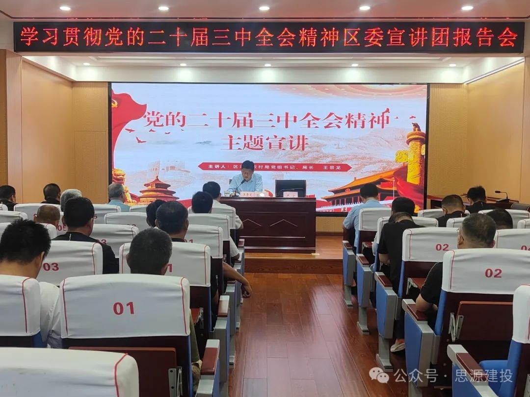9月14日,學習貫徹黨的二十屆三中全會精神沾化區委宣講團報告會在濱州市思源建設投資發展有限公司舉行。區委宣講團成員,區農業農村局黨組書記、局長王景龍同志宣講報告,濱州市思源建設投資發展有限公司黨委書記、董事長盧寧主持報告會。