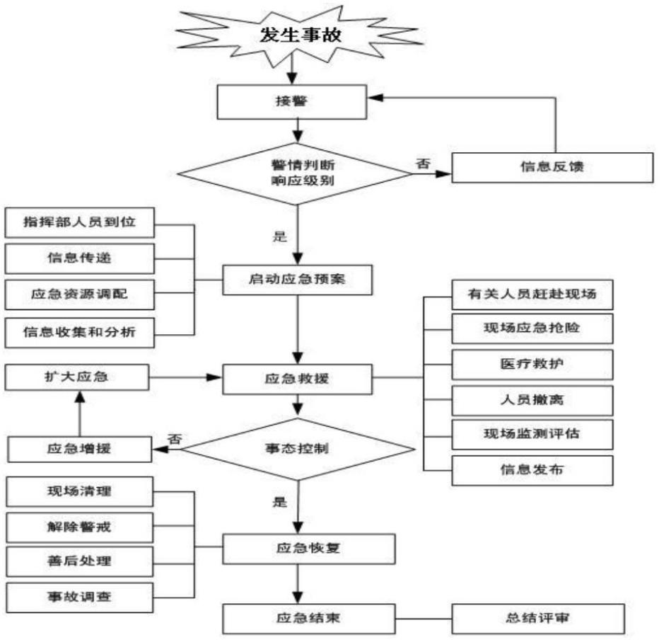 接事件報(bào)告→統(tǒng)一應(yīng)急指揮→現(xiàn)場應(yīng)急處置→對事件進(jìn)行初始評估→通知應(yīng)急處置單位→迅速組織人員、設(shè)備、物資到現(xiàn)場。