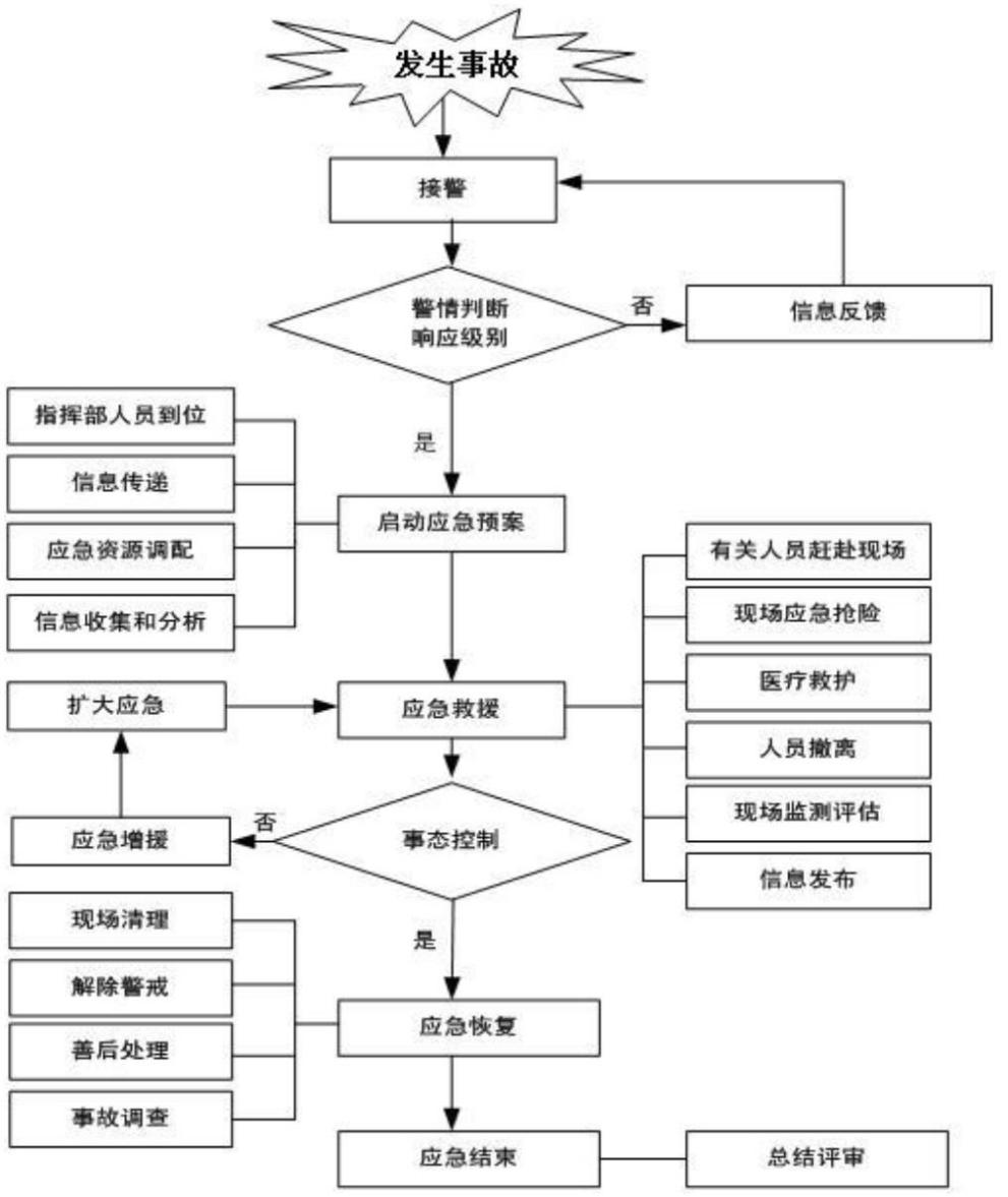 接事故報告、統一應急指揮、現場應急救助、對事故進行初始評估、通知應急救援單位、實施應急救援方案。